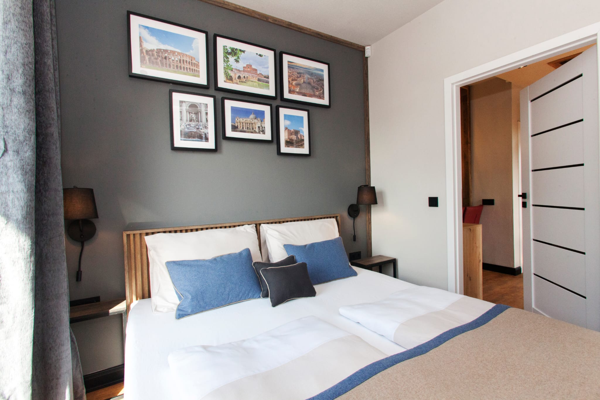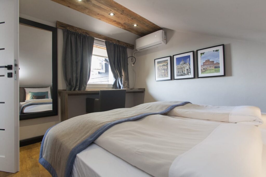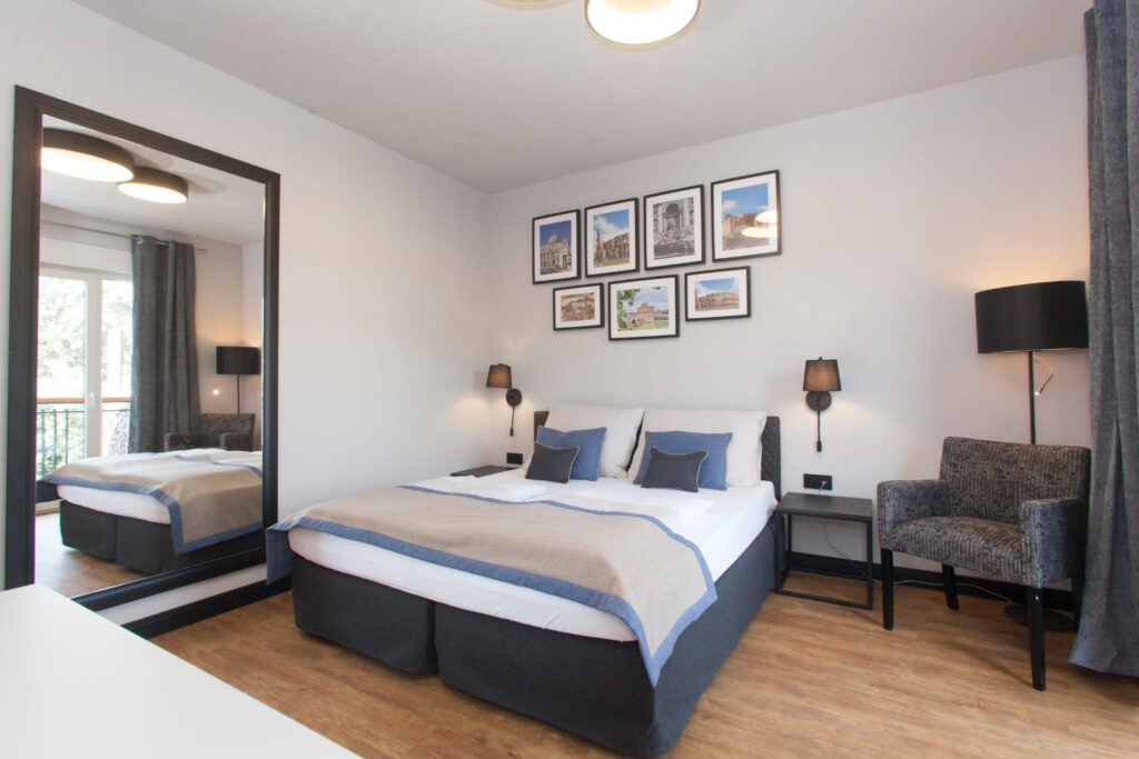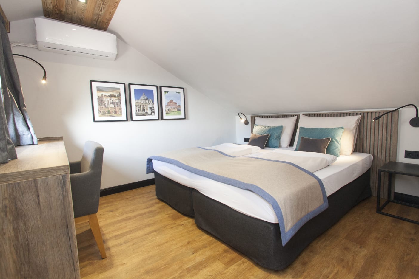 The first bedroom is located on the first floor. It has a comfortable double bed (can be separated into two singles) and a dedicated workspace.