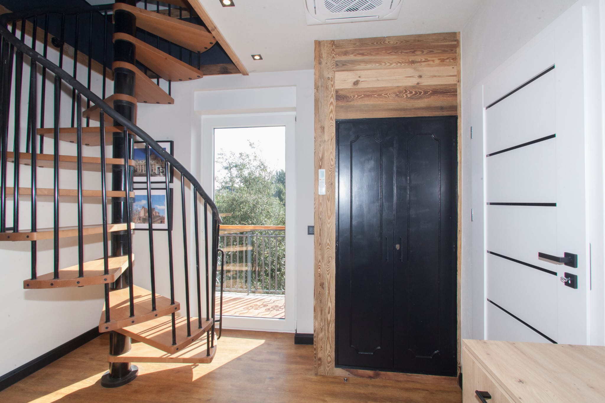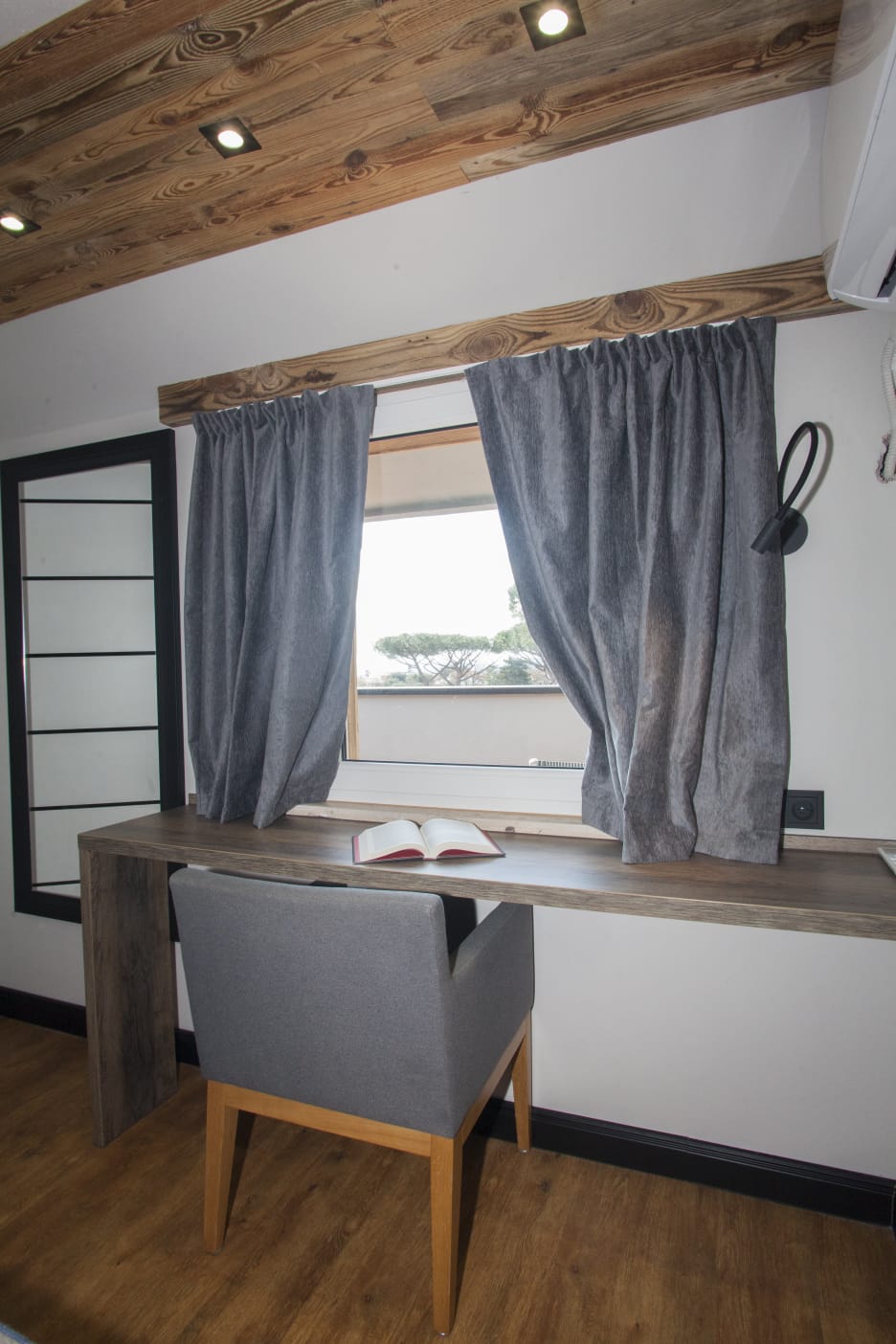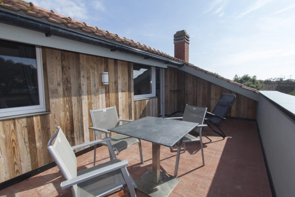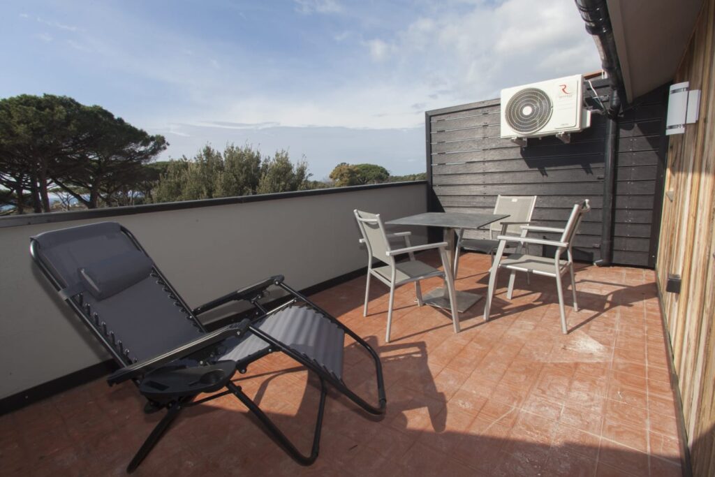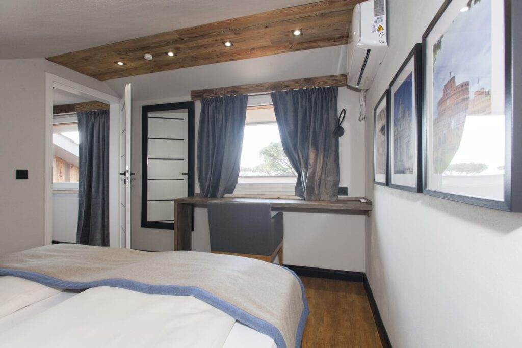 The last bedroom is located on the second level. There is a double bed (with the possibility of separating into two singles) and a workspace. The bedroom has a large, private viewing terrace with sun loungers and a table and chairs.